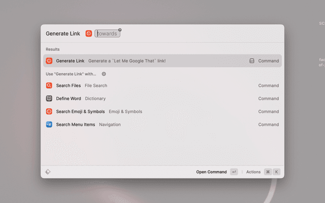 To use the LetMeGoogleThat Raycast Extension, simply open the Raycast app and type 'Generate Link', click the box next to it followed by your search term. Hit enter and you'll be presented with a custom link to the 'Let Me Google That For You' website.