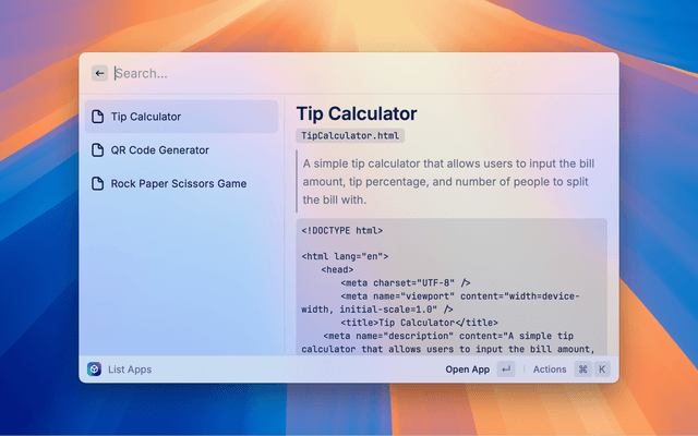 Allow Raycast AI to create HTML apps. They're stored in the extension support directory, but you can access them at any time with the List Apps command to open or delete them.