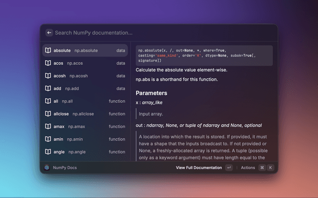 A Raycast extension that lets you search the NumPy API reference and preview detailed documentation without leaving Raycast. Results include function signatures, descriptions, parameters, and return values, with quick actions to open the official docs in your browser.