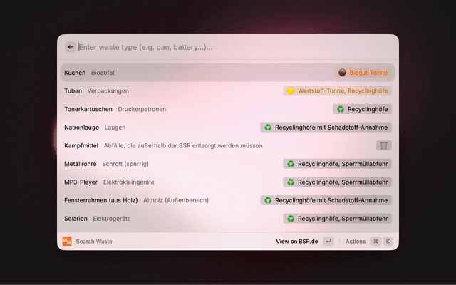 ⌘C⌘⇧,For the Collection Calendar command, open the extension preferences and enter your Berlin street name and house number. The Search Waste command works without any configuration.