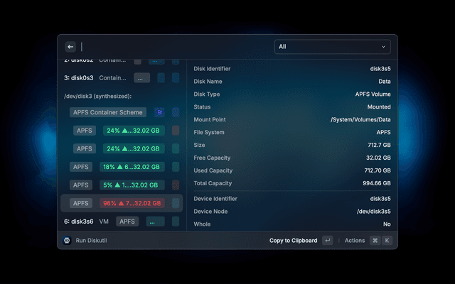 View your disks and volumes. An implementation of the macOS 'diskutil' command with quicker access to functionality, providing a better overview and a more user-friendly interface.