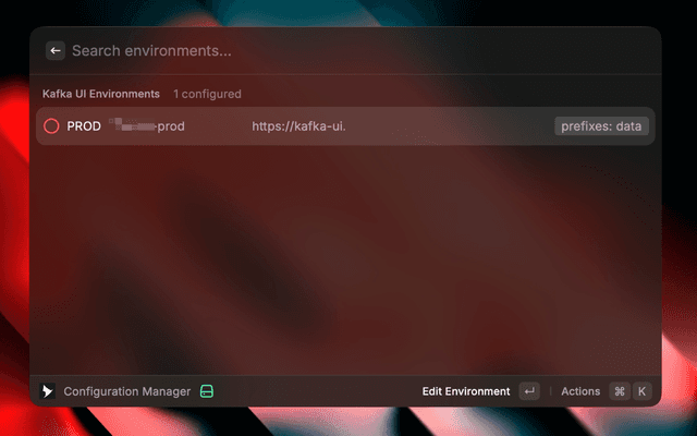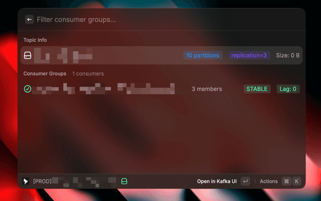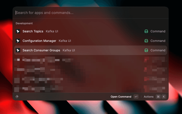 This extension connects to your Kafka UI instances and provides quick access to consumer group lag monitoring and topic browsing directly from Raycast.