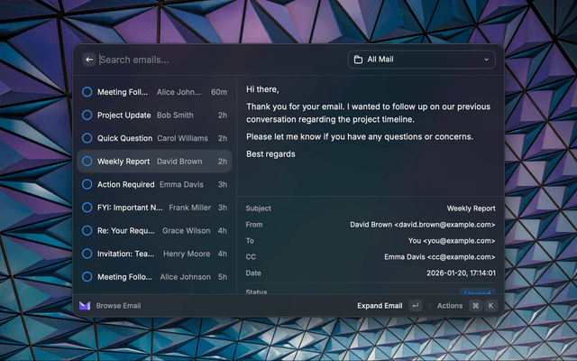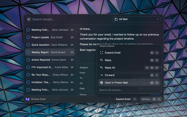 View and manage your Proton Mail inbox directly in Raycast via Proton Mail Bridge.