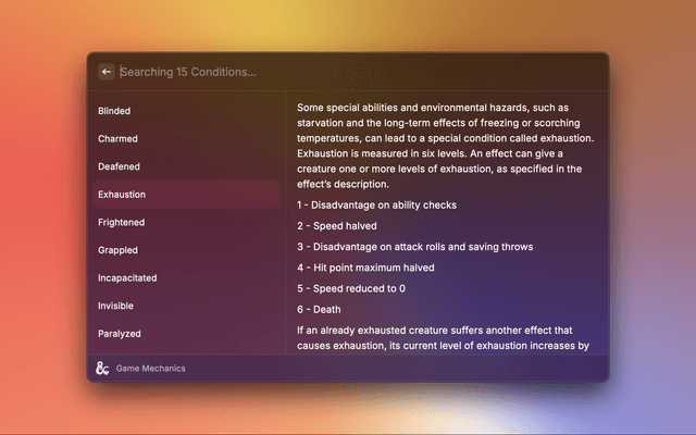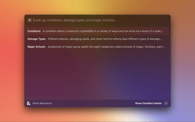 • Game Mechanics - Lookup Conditions, Damage Types, and Magic Schools info.