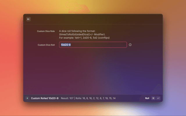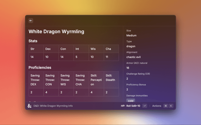 Look up monsters, spells, rules, and mechanics, all while rolling advanced dice, and even generate random encounters for your party in a pinch. This extension utilizes the DND5api API to pull and present all data related to D&D 5th edition. An API token is not required.
