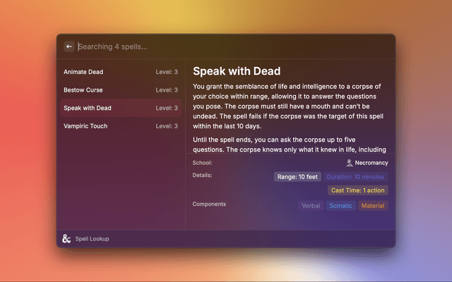 • Spell Lookup - View details on 300+ D&D spells by level and school of magic.