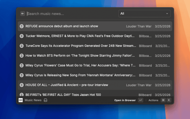 Read the latest music news from various sources directly in Raycast.