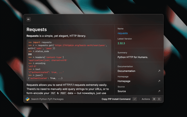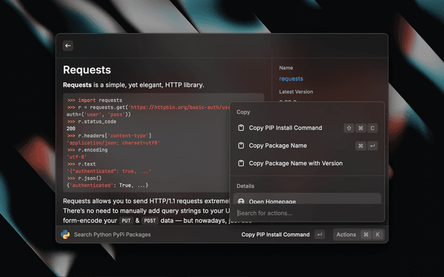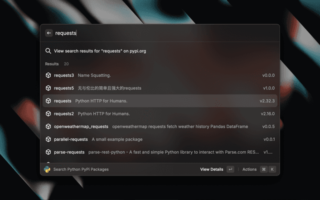• Search PyPI packages from Raycast and read all details.
