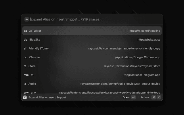 Better Aliases is an opinionated aliases and randomized snippets. Raycast in Raycast.