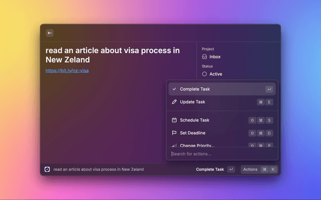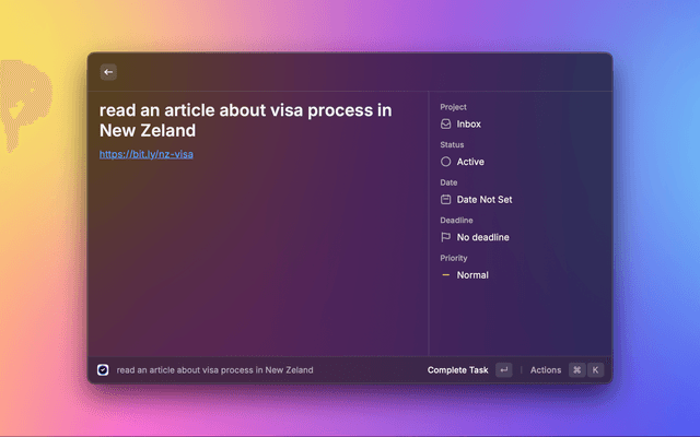 - Create Tasks: Quickly add new tasks with title, notes, priority, dates, and project assignment