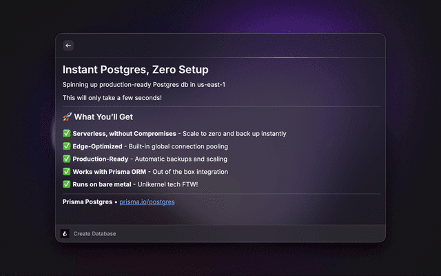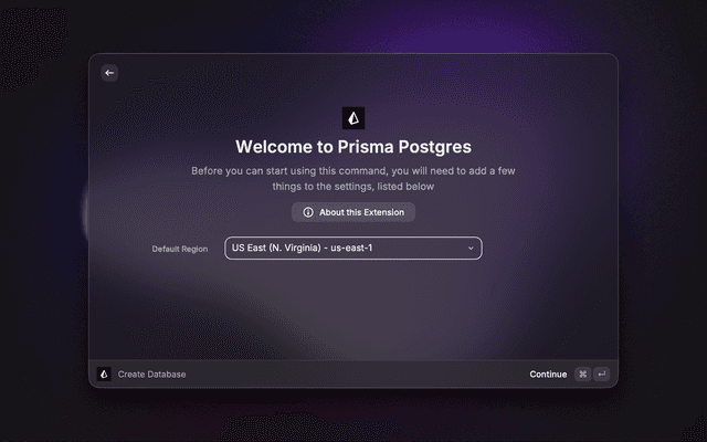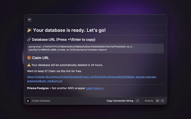 Create and manage Prisma Postgres databases instantly with zero setup. Get production-ready Postgres databases in seconds, directly from Raycast.