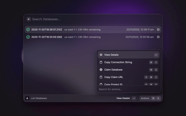 • List Databases: View all your previously created databases with connection strings, expiry status, and claim URLs.