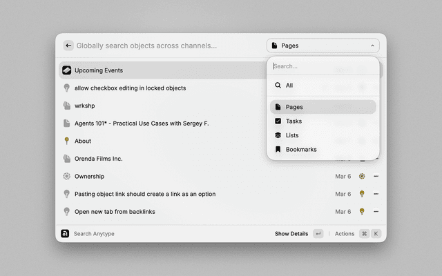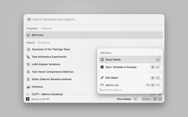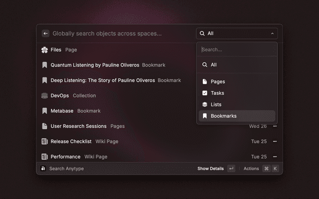 - Open: Use Command+Enter to instantly open the currently selected space or object in Anytype.