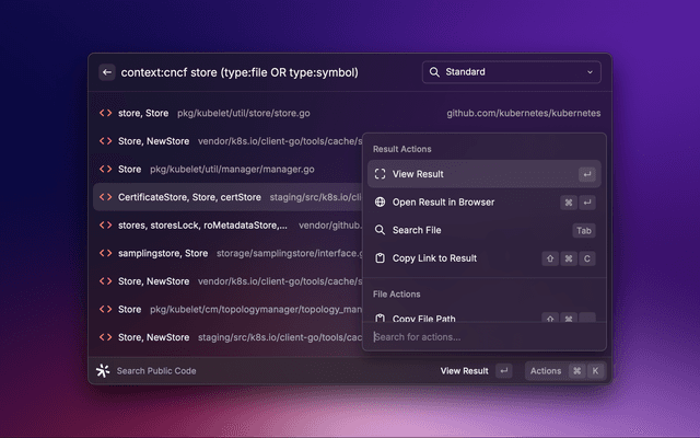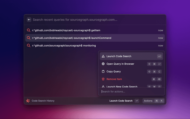 To get started, install Raycast and install the Sourcegraph extension from the Raycast extensions store.