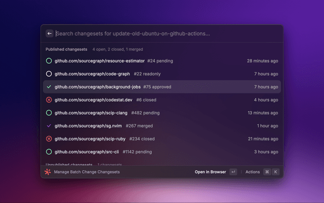 Browse, view, publish, and merge changesets for batch changes straight from Raycast. Batch Changes automate large-scale code changes to keep your code up to date, fix critical security issues, and pay down tech debt across all of your repositories.