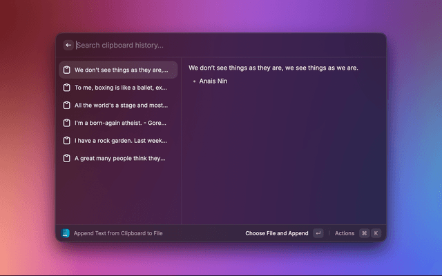 | Append Text from Clipboard to File | Pick text from clipboard history and append it to a file. |