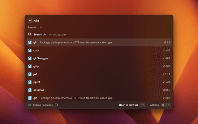 This Raycast extension allows you to search Golang packages on pkg.go.dev.