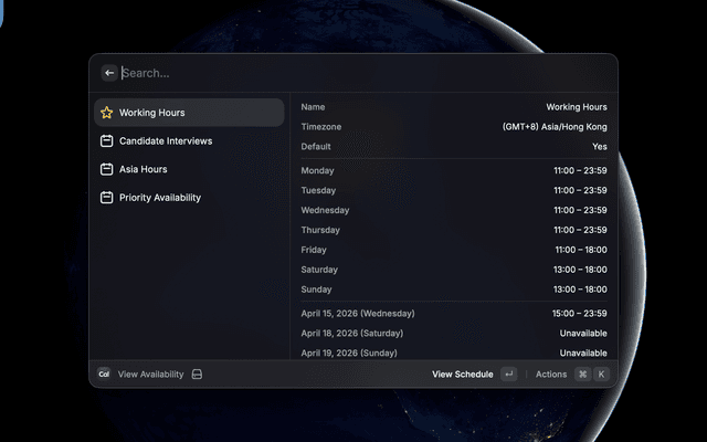 Manage your Cal.com account from Raycast — share meeting links, generate private one-time links, view and act on bookings (accept / decline / cancel / request reschedule), manage availability schedules, and schedule out-of-office entries.