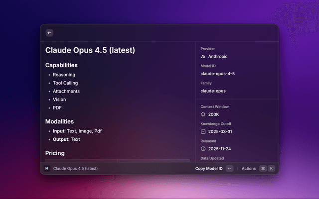 Explore AI model specifications, pricing, and capabilities from models.dev