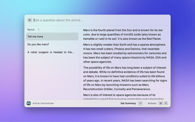 This Raycast extension offers a versatile tool for interacting with a wide range of web articles by generating concise summaries and enabling interactive dialogues with the content. It integrates AI capabilities to assist with everyday inquiries and tasks, now with support for the ChatGLM API.