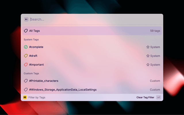 ⌘ + T to open a dedicated tag search interface with sections⌘ + E to show/hide color-coded tags⌘ + ⇧ + T when a tag is selected to clear the filterTag Visualization: