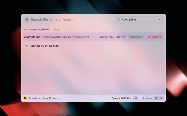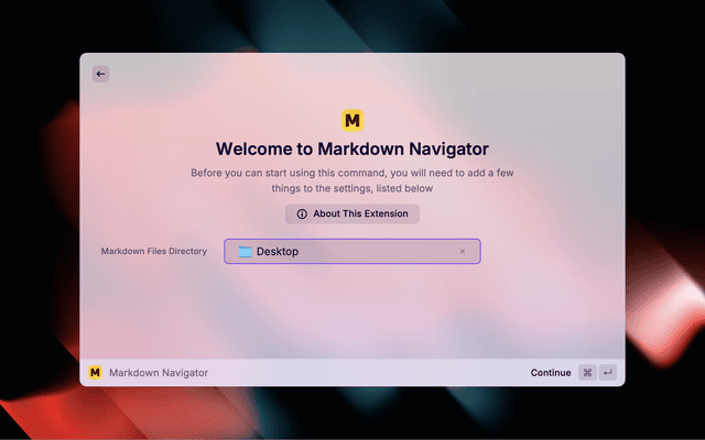 ⌘ + R to refresh the file list⌘ + ⇧ + P to open extension preferencesThe extension asynchronously indexes all supported Markdown files in your configured directory, then displays them with pagination for easier browsing. If you have a large collection of Markdown files, you can: