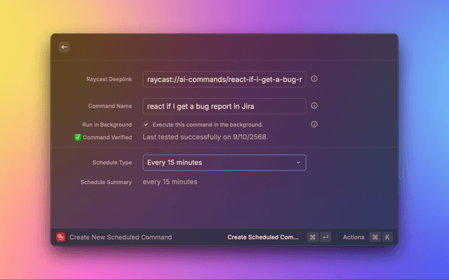 This extension allows you to schedule any Raycast command to run automatically at specific times or intervals. Perfect for automating repetitive tasks, running periodic checks, or executing AI commands on a regular basis.