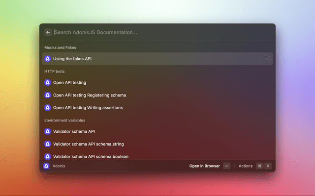 Allows instant access to AdonisJS documentation search from within Raycast.
