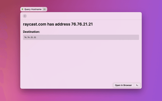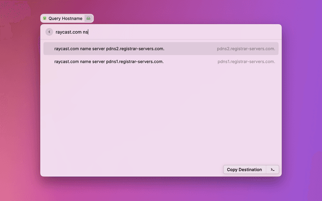 DNS lookup and nameserver query using the built-in host command on macOS. Built for Raycast.