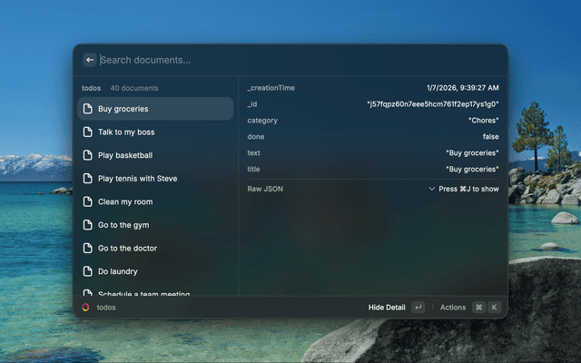 Interact with your Convex projects directly from Raycast. Switch between projects, run functions, browse tables, view real-time logs, search documentation, and explore components without leaving your keyboard.