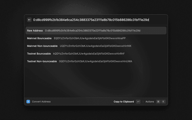 Convert TON blockchain addresses between different formats and resolve .ton domain names.