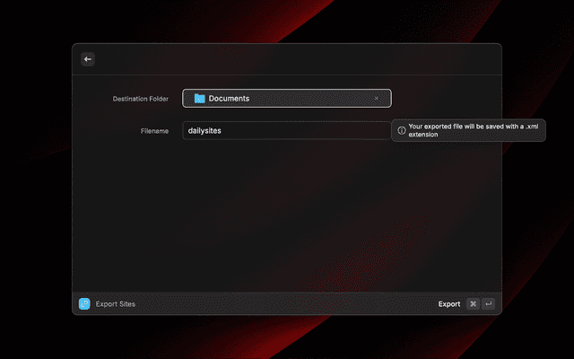 The first time you open the extension you will be asked to choose an XML folder, this defaults to your Documents folder. This folder is used by the “Export Sites” and “Import Sites” commands. It’s where exported XML files are saved and the default import directory.