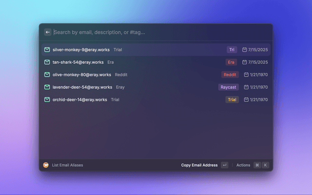 • Copy Email: Press ⌘C to copy the alias's email address.