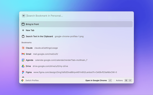 Enter ↵to enter a profile's bookmarks,⌘ ↵to open (or focus) the profile chrome window, or⌘ ⇧ ↵to open a new window for the profile.