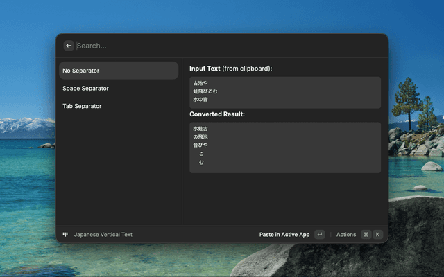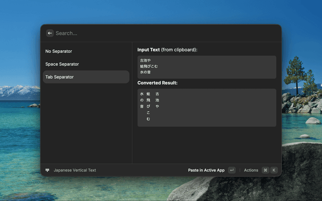 Convert text to Japanese vertical writing (縦書き). Transforms horizontal text into right-to-left vertical columns.