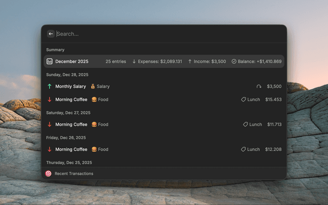 Search EntriesAdvanced filtering by date range, type, category, tags, account, and description
