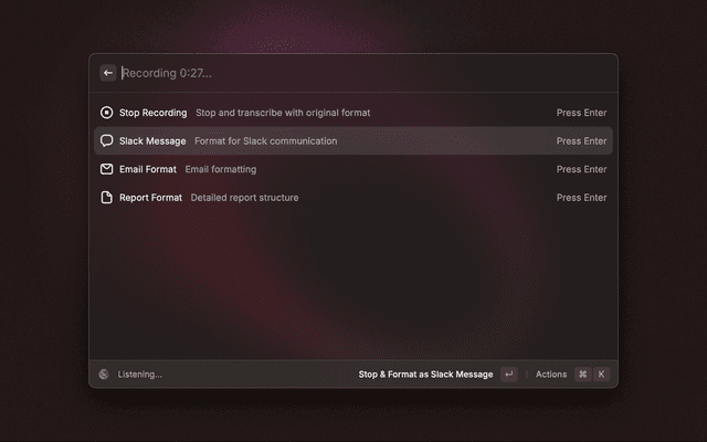 - Press Enter to stop and transcribe, or select a specific format (Email, Slack, Report)
