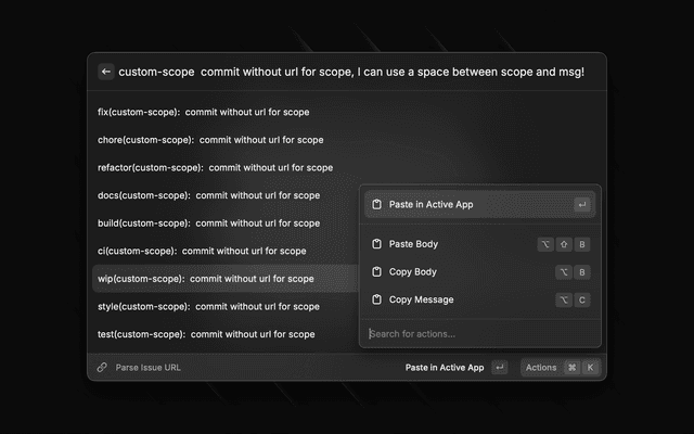 Enter to paste in your active app the commit message you've selectedWhile typing your url, you can specify optional parameters separated by , in the following order: