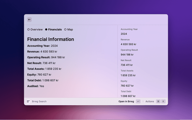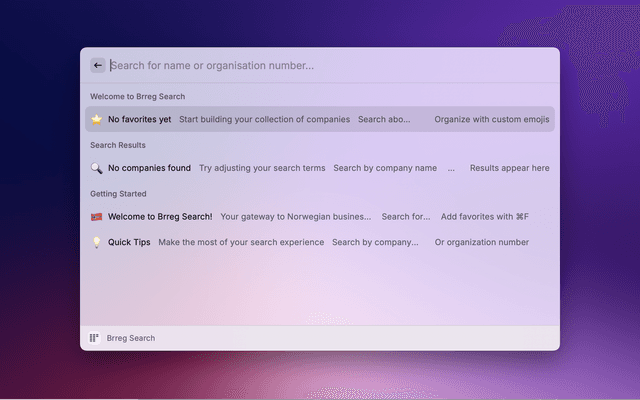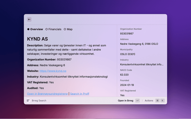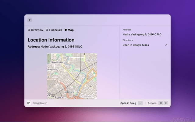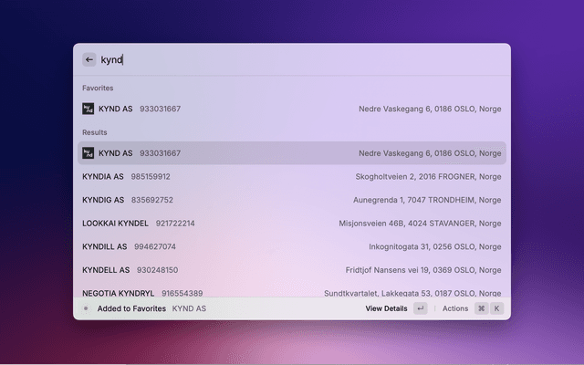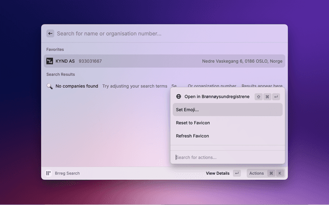Search for Norwegian companies directly from Raycast. View company details, financial information, and locations. Save favourites for quick access. All data comes from the official Brønnøysund Register Centre (Brreg) API.