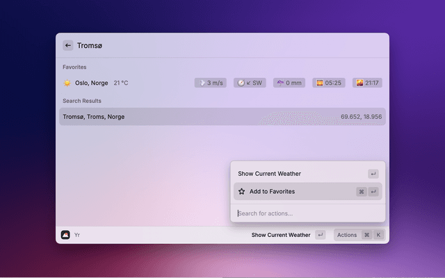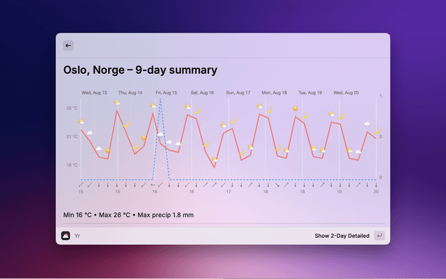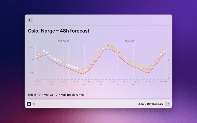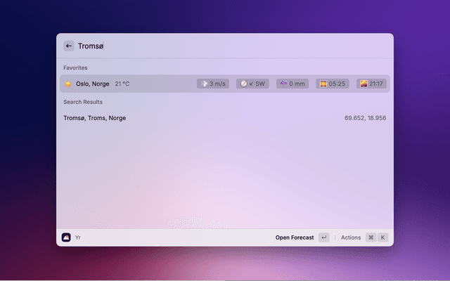 Norwegian weather data from MET, wrapped in a Raycast extension. Search locations, save favorites, get 9-day forecasts with graphs. No API keys, no fuss.