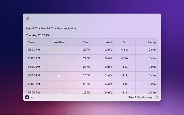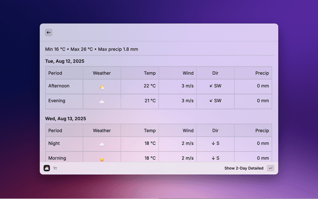 Search a location (3+ chars) → Enter to open forecast → D / G to flip between graph and data table → Cmd+R to refresh.