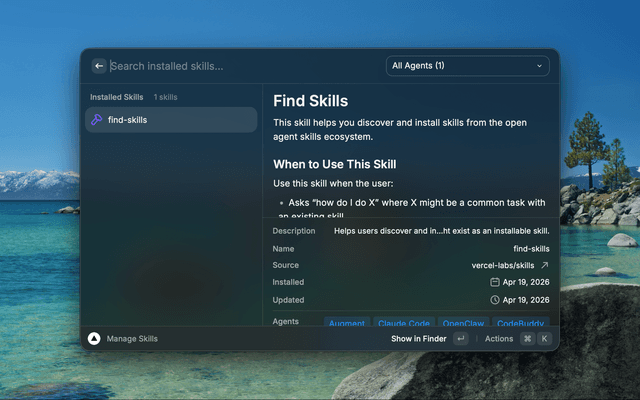- View skill details inline with SKILL.md content, including description, license, compatibility, and allowed tools (toggle with Cmd+D)
