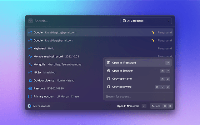 Search, open or edit your 1Password passwords from Raycast