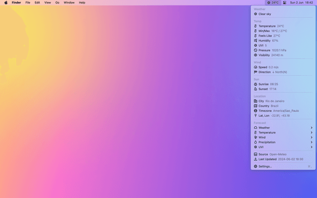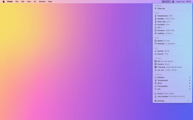 Show current weather on the menu bar. Weather information updated every 30 minutes.