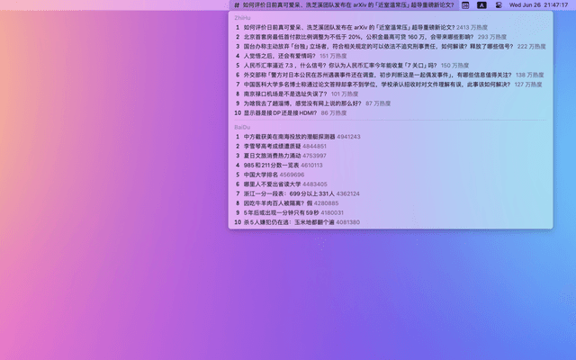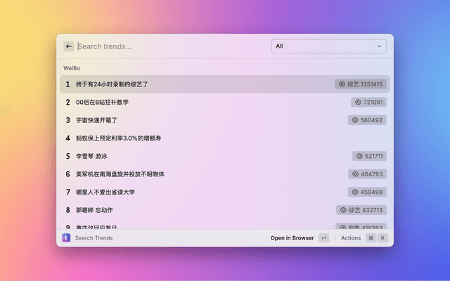 Show trends on WeiBo, ZhiHu, DouYin,BaiDu, TouTiao, BiliBili.