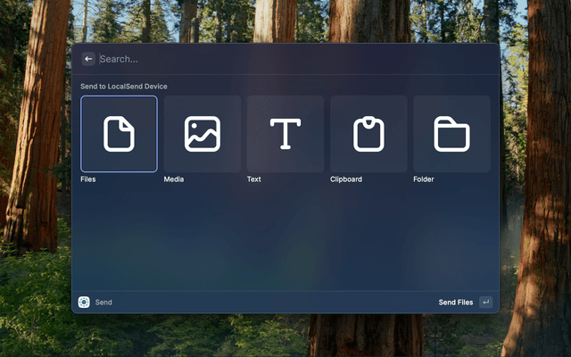 | Send | Choose what to send (files, text, clipboard, etc.) | Quick launcher for all send options |