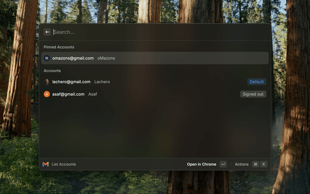 The extension reads your Chrome cookies to identify Google accounts you're logged into, then displays them in a convenient list within Raycast. You can then quickly access your Gmail inbox for any account with a single click.