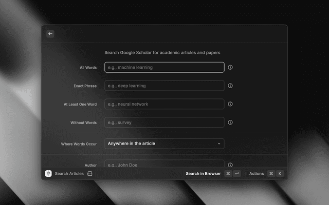 This extension provides a clean, efficient interface to search Google Scholar directly from Raycast. Instead of web scraping, it constructs proper Google Scholar search URLs and opens them in your browser, ensuring full compliance while maintaining excellent usability.