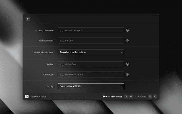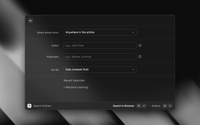 By opening searches in your browser, you get the full Google Scholar experience with all its features, while the extension provides the convenience of advanced search construction from Raycast.