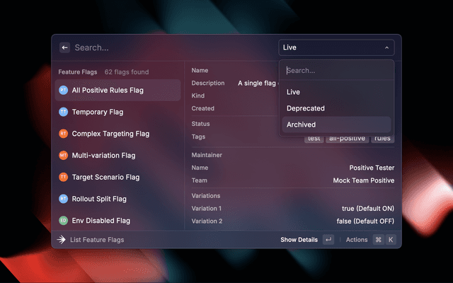 - Filter flags by state using the dropdown (Live/Deprecated/Archived)
